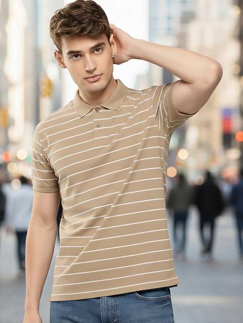 Ogen Men's Fawn Cotton Blend Half Sleeves Striper Polo T-shirt
