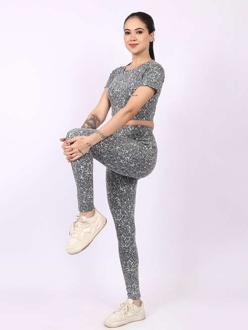 Women’s Printed Activewear Set – Crop Top & High-Waist Leggings (Gray Print) Upgrade your workout wardrobe with this stylish women’s printed activewear set, designed for comfort, performance, and everyday versatility. The set includes a short-sleeve crop top paired with high-waist leggings, featuring a subtle all-over geometric print that adds a modern, sporty edge. Crafted from soft, stretchable, and breathable fabric, this activewear set allows full freedom of movement while maintaining a flattering fit. The high-rise leggings provide excellent support and a smooth silhouette, making them perfect for yoga, gym workouts, running, or casual athleisure wear. The crop top offers a comfortable, body-hugging fit that keeps you cool and confident throughout the day. Ideal for fitness sessions or relaxed everyday styling, this coordinated set combines fashion and functionality effortlessly. Key Features: Premium stretch fabric for comfort and flexibility Stylish printed design for a modern athletic look