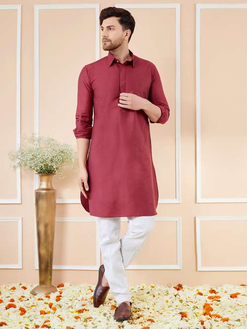 Introducing our Maroon Cotton Solid Pathani Kurta, featuring a stylish Shirt collar, a sleek straight hemline, and side slits