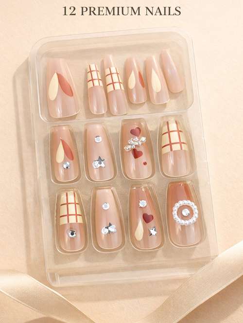 Premium Nude Glossy Stick-On Artificial Nails Set of 12 with Rhinestone & Star Design